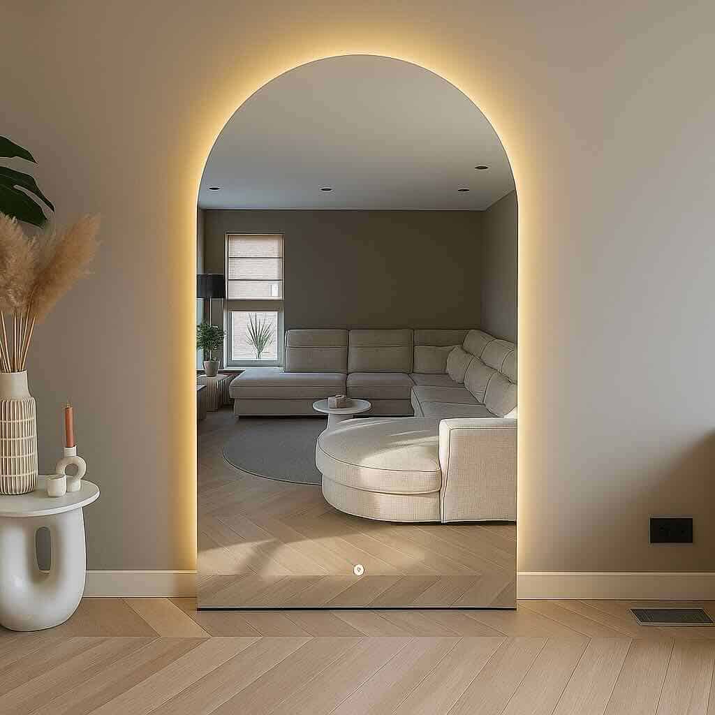 Deze LED-spiegel combineert functionaliteit met een uitgesproken gevoel voor stijl. Deze grote boog spiegel met moderne uitstraling geeft elke ruimte van badkamer tot hal of slaapkamer een artistiek en eigentijds karakter.
