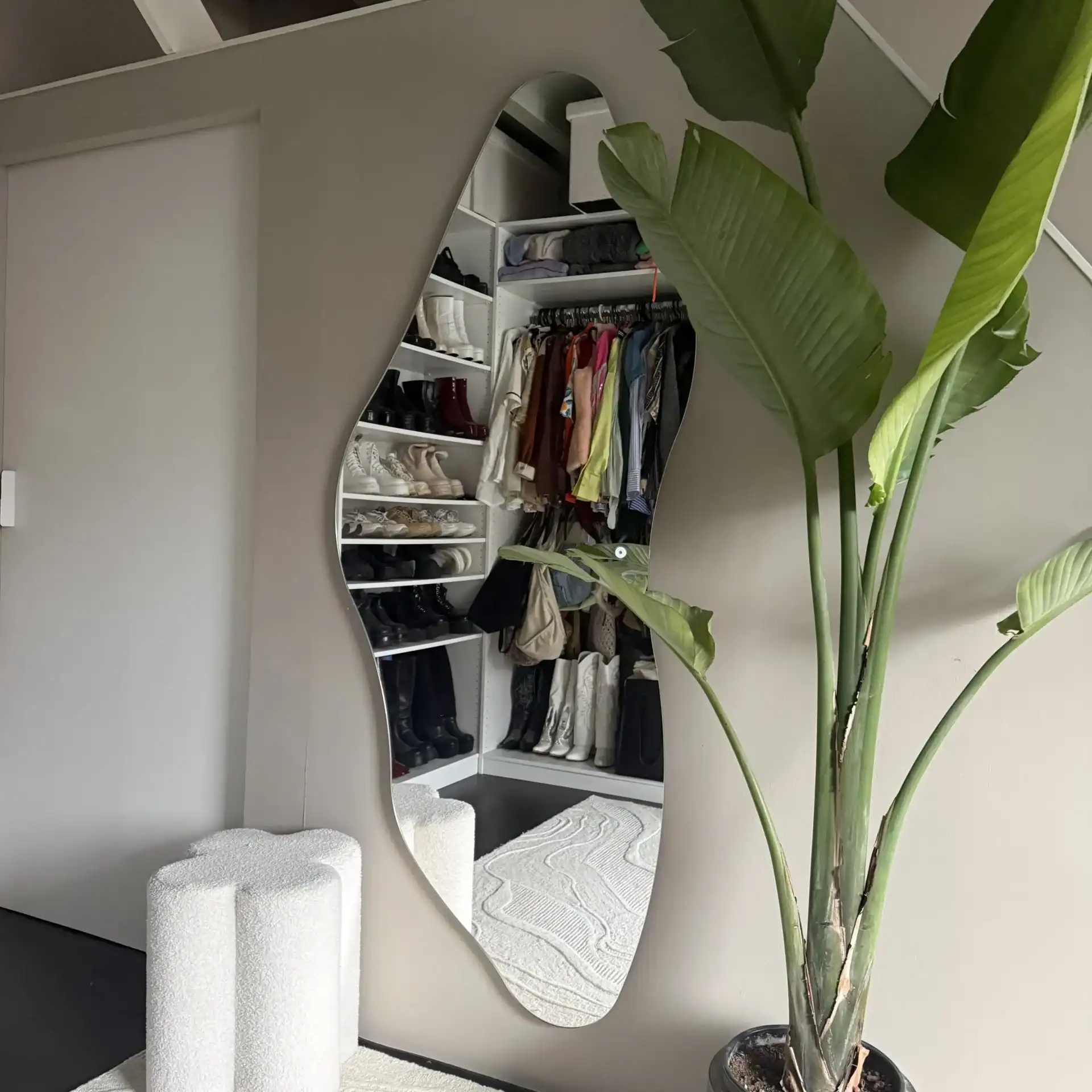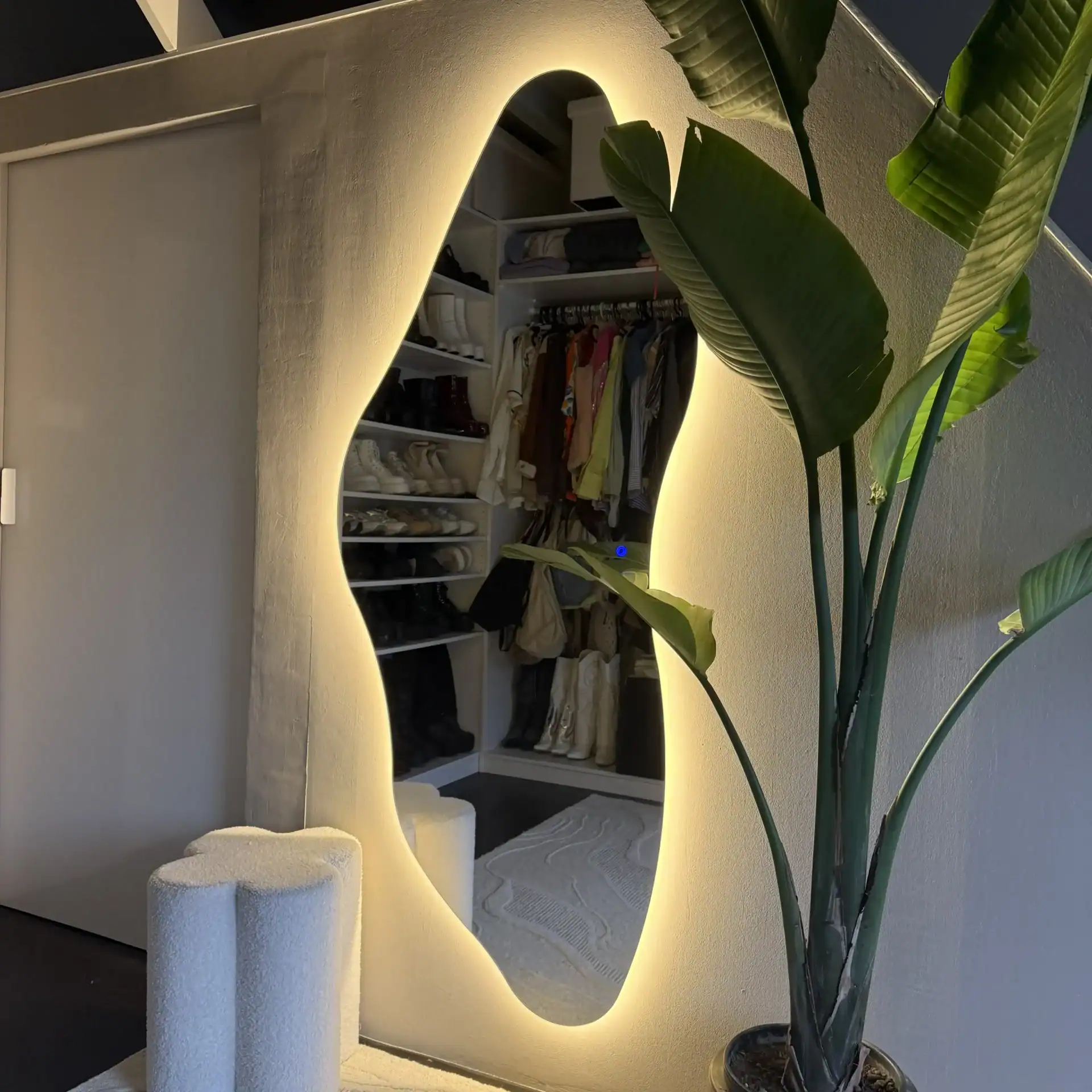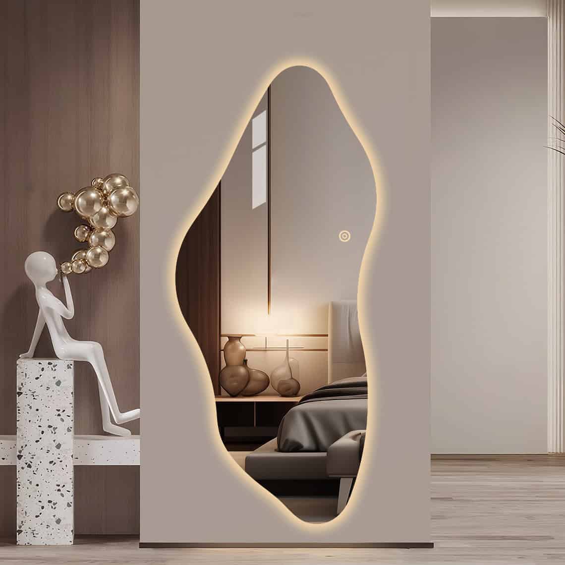 Deze LED-spiegel combineert functionaliteit met een uitgesproken gevoel voor stijl. Met zijn golvende, abstracte vorm en moderne uitstraling geeft hij elke ruimte, van badkamer tot hal of slaapkamer, een artistiek en eigentijds karakter.
